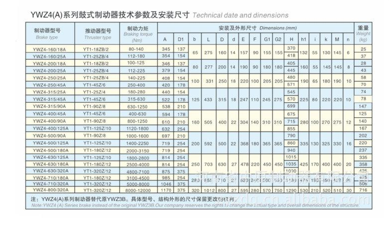 YWZ4-A系列電力液壓鼓式制動(dòng)器連接尺寸和制動(dòng)力矩參數(shù)符合GB6333-86標(biāo)準(zhǔn),技術(shù)要求符合JB/T6406-2006標(biāo)準(zhǔn);